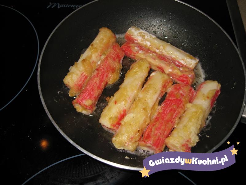 Na patelni mieszamy olej z masłem, na gorący tłuszcz dajemy paluszki rybne, dodajemy przyprawy i smażymy do zarumienienia się ryby.