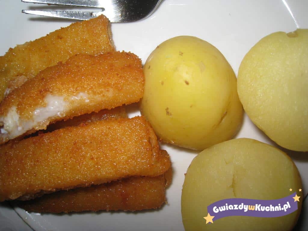 Ziemniaki obieramy i gotujemy w osolonej wodzie na półtwardo, odcedzamy i przekładamy do naczynia żaroodpornego, na ziemniaki wkładamy paluszki rybne, solimy, pieczemy w piekarniku około pół godziny.