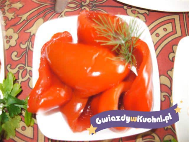 Paprykę myjemy, wybieramy środki, kroimy w grubsze paski. Ocet mieszamy z przyprawami, zalewamy paprykę, pozostawiamy paprykę na 12 godzin w zalewie. Po 12 godzinkach zlewamy zalewę, papryczki układamy w miseczkę, dekorujemy gałązką koperku. Smacznego.