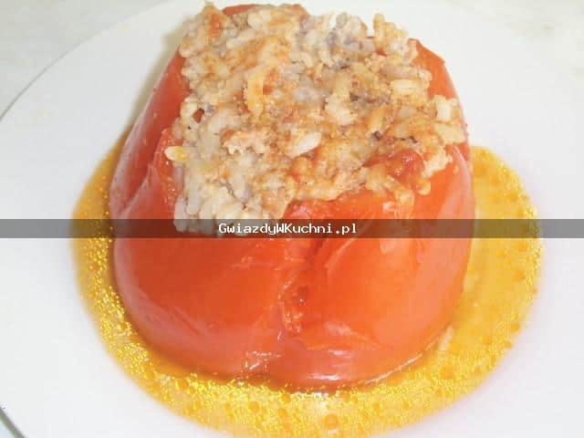Paprykę oczyścić i przygotować do nadziewania. Ryż zalać gorącą wodą i po kilku minutach odcedzić. Cebulę pokrojoną przesmażyć na maśle, dodać ryż poszatkowaną marchew, pokrojone pomidory, sól i pietruszkę. Smażyć wszystko i wystudzić. Strąki nadziać farszem. Nadzianą paprykę ułożyć w rondlu zalać wodą do połowy i gotować 1 godzinę.Z mąki i masła zrobić zasmażkę. Rozprowadzić wywarem i zagotować. Podprawić żółtkiem i zalać sosem papryki.