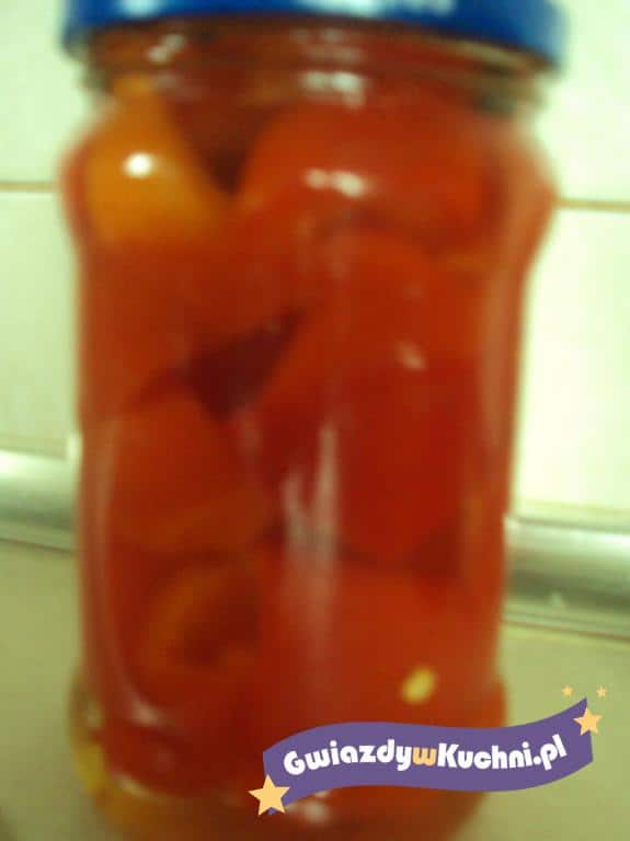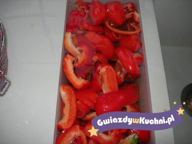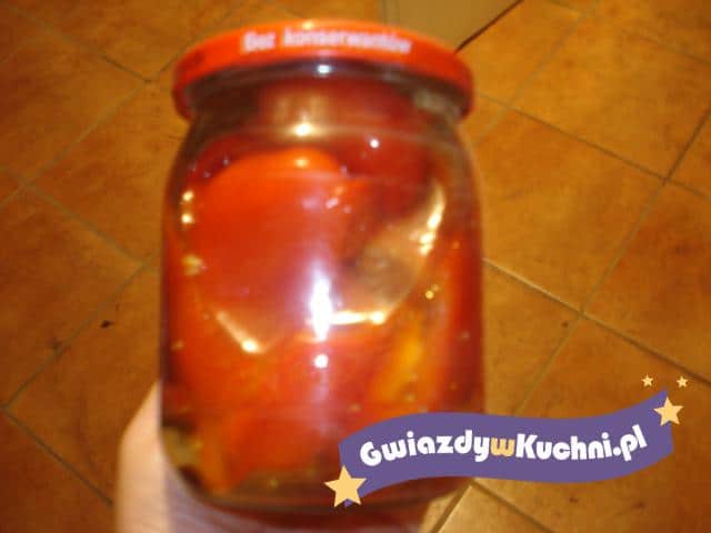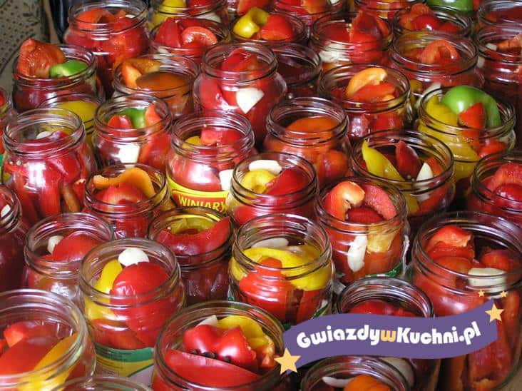 Paprykę umyć, oczyścić, pokroić w paski. Słoiki umyć, wyparzyć. Paprykę układać ciasno w słoikach. Dodać po liściu laurowym, łyżeczce gorczycy i kilka ziaren pieprzu. Ugotować zalewę z podanych składników. Przestudzić i zalać paprykę. Zakręcić i pasteryzować ok 5 – 10 minut od momentu zagotowania.