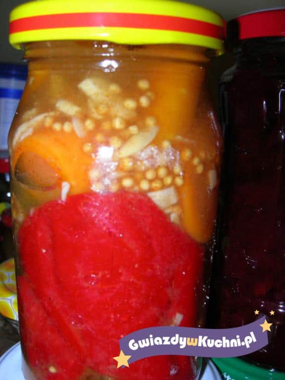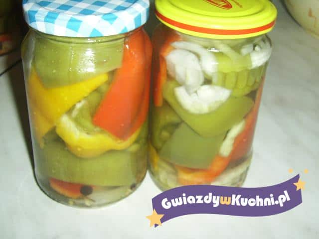 Paprykę należy oczyścić z gniazd nasiennych, umyć, odłożyć do odcieknięcia. Paprykę należy pokroić w ćwiartki i ułożyć w słoikach. Z octu, wody, miodu, soli i przyprawy należy przygotować zalewę. Po zagotowaniu zalać nią paprykę, od razu zakręcać i pasteryzować około 5- 10 minut.