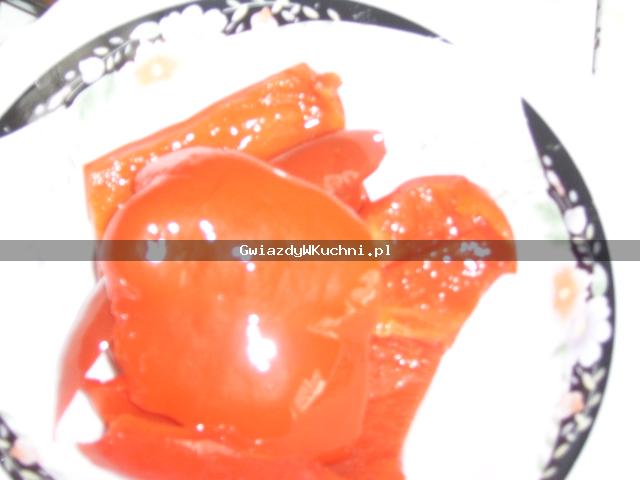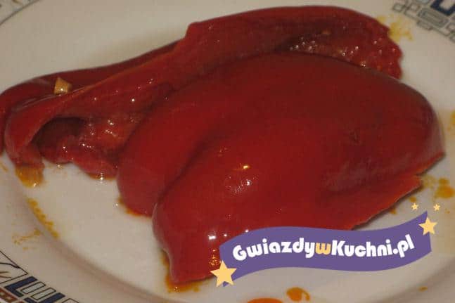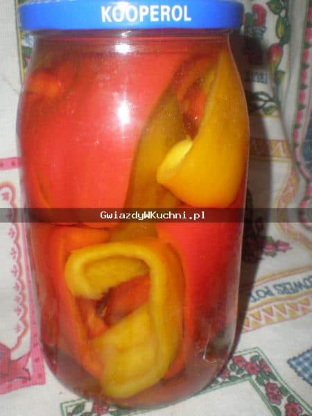 Paprykę należy dokładnie umyć, pozbawić ich gniazd nasiennych i pokroić w paski grubości około 3- 5 cm. Paski papryki wkładamy do słoika, dodajemy ziarnko pieprzu i ziela angielskiego oraz liść laurowy, następnie kawałek marchewki, czosnku i łyżkę oleju, zalewamy zalewą przygotowaną z 2, 5 litra wody, 1,5 litra octu, 4 łyżeczek soli i 2 łyżeczek cukru.