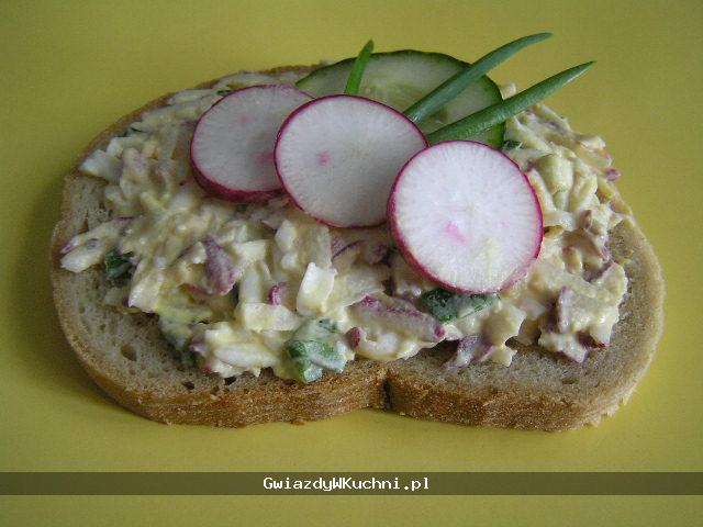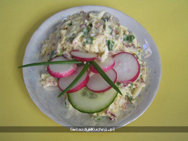 Rzodkiewki umyć, zetrzeć na tarce o grubych oczkach, zostawić kilka do dekoracji. Ogórek obrać i pociąć w drobną kostkę. Szczypiorek opłukać, osączyć, posiekać. Połączyć rzodkiewkę z ogórkiem, dodać natkę pietruszki, przyprawić do smaku solą i pieprzem oraz majonezem. Podawać z pieczywem. Można udekorować plastrami rzodkiewek, ogórka i szczypiorkiem.