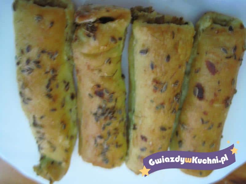 Wszystkie składniki na farsz wymieszać i doprawić solą i pieprzem. Następnie ciasto rozwałkować, wyciąć kwadraciki, kłaść wcześniej przygotowany farsz i składać w rulonik.