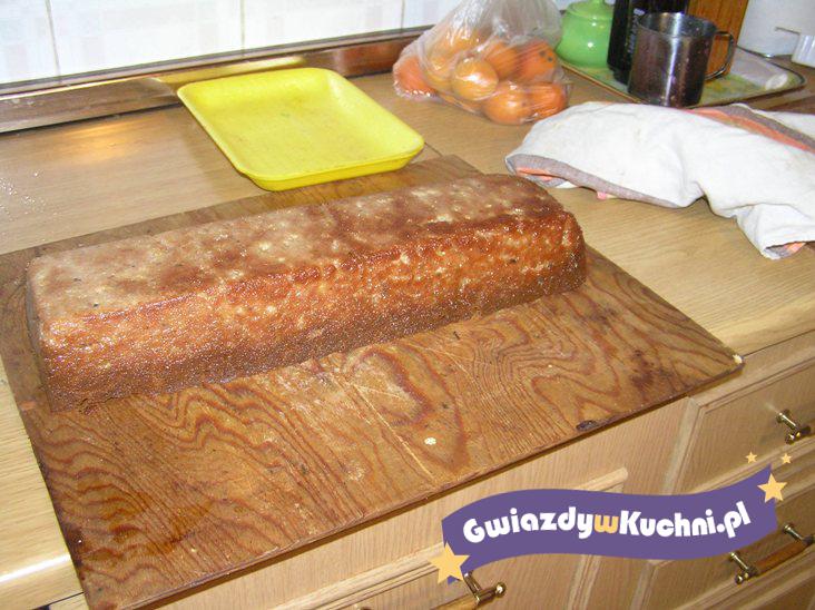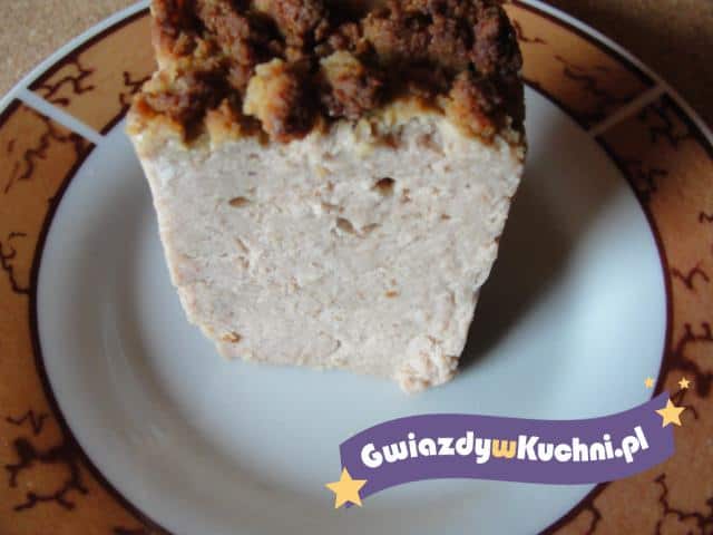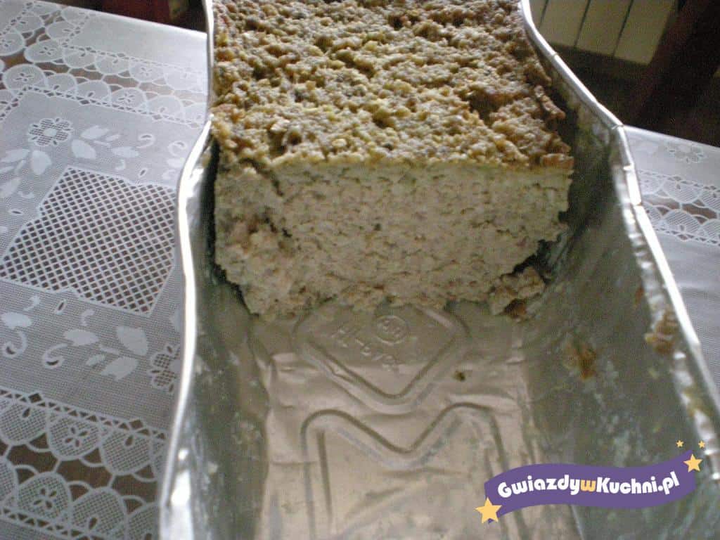 Masą napełnić formę do pasztetów, na wierzchu ułożyć smażone filety z kurczaka. Przykryć, piec około 50 minut w temperaturze 200°C.