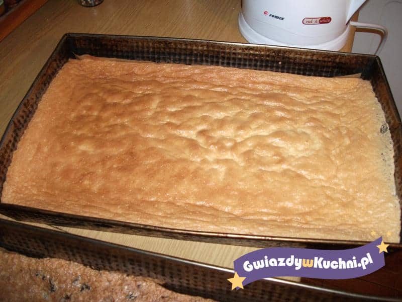 Z białek ubić pianę. Żółtka jaj utrzeć z cukrem, dodać obie mąki i proszek do pieczenia, wymieszać. Następnie dodawać porcjami pianę z białek ciągle mieszając( delikatnie). Ciasto przelać do wyłożonej pergaminem blaszki i piec około 35- 40 minut w temp. 180 stopni. Biszkopt można zabarwić kakao lub kisielem.