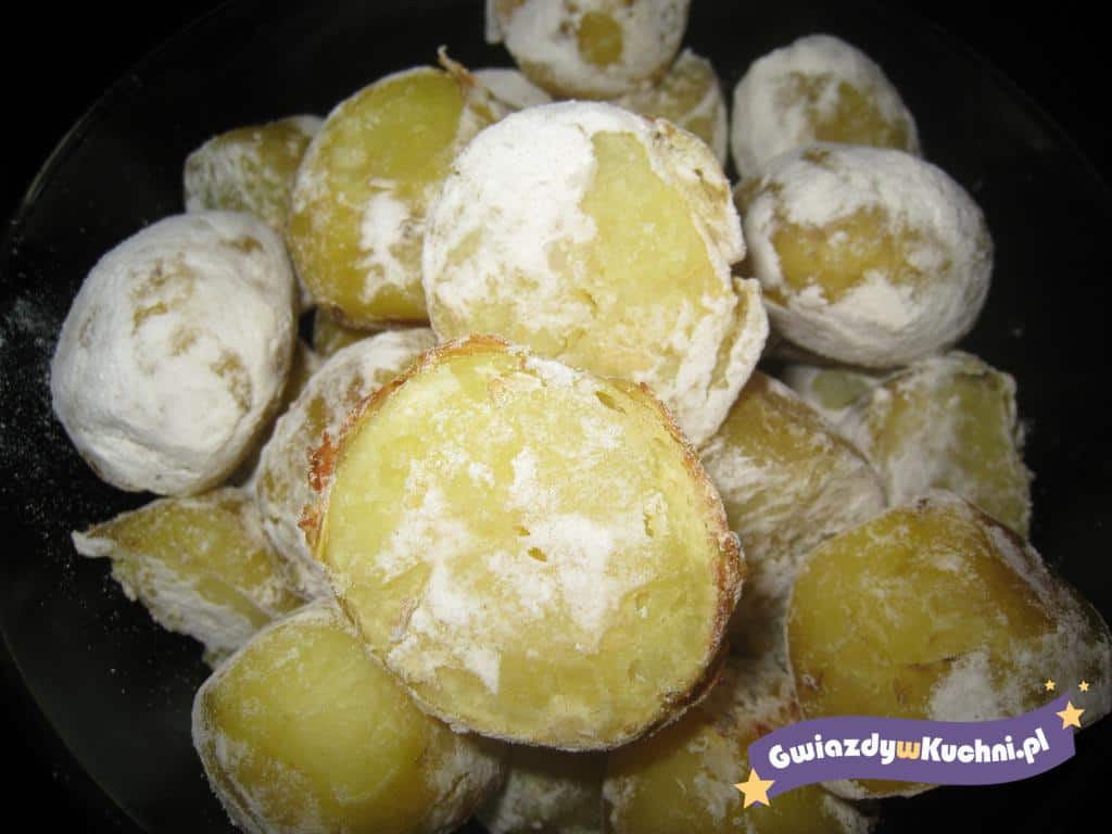 Obrać ziemniaki, umyć i ugotować na półtwardo z dodatkiem soli. Chłodne ziemniaki obtoczyć w mące, ułożyć na blaszce, wstawić do nagrzanego piekarnika. Piec ziemniaki na złoty kolor 30 minut. Pod sam koniec pieczenia polać masełkiem