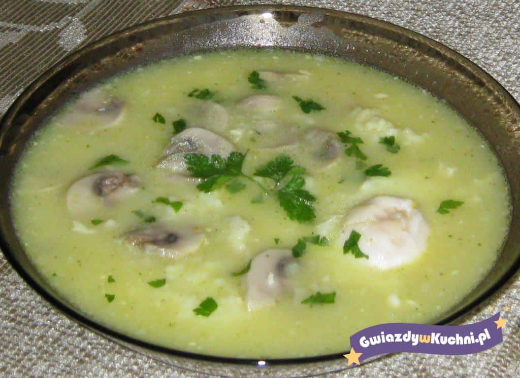 Pieczarki umyć i pokroić na plasterki. Cebulę obrać i drobno pokroić. Na patelni rozgrzać masło i przesmażyć pieczarki z cebulą. Rosół albo dowolny bulion zagotować dodać pieczarki i cebulę. Wsypać ryż i gotować często mieszając. Jajka wybić na talerzyk i zsunąć do zupy, chwilę nie mieszać doprawić do smaku. Dodać śmietanę i posiekana natkę.