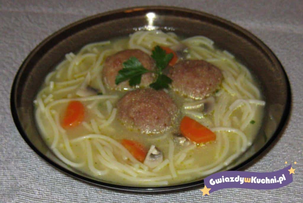 Pieczarki umyć, pokroić i przesmażyć na maśle. Zalać ok. 2 litrami wody. Gotować. Marchew obrać, zetrzeć na tarce, dodać do zupy. Do mięsa dodać mannę i posiekaną cebulę, doprawić do smaku. Zarobić masę. Z masy formować małe pulpeciki, obtaczać w mące i wrzucać na gotującą się wodę z pieczarkami. Gotować 10-12 minut. Doprawić do smaku. Dodać posiekaną natkę pietruszki i śmietanę. Podawać z makaronem. Pulpety przed dodaniem do zupy można obtoczyć w bułce tartej i obsmażyć na tłuszczu.