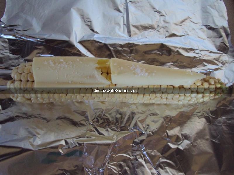 Kukurydzę obieramy z zielonych listków. Kładziemy ją na folii aluminiowej. Smarujemy po kukurydzy masełkiem i posypujemy solą. Pieczemy w piekarniku 12 minut w 180 stopniach.