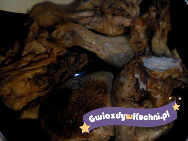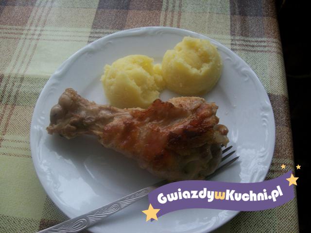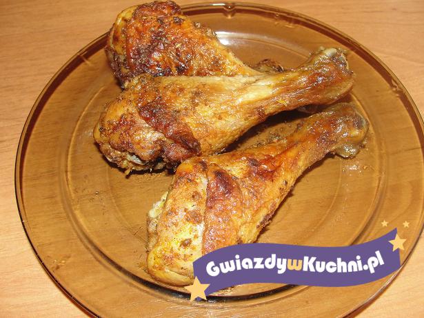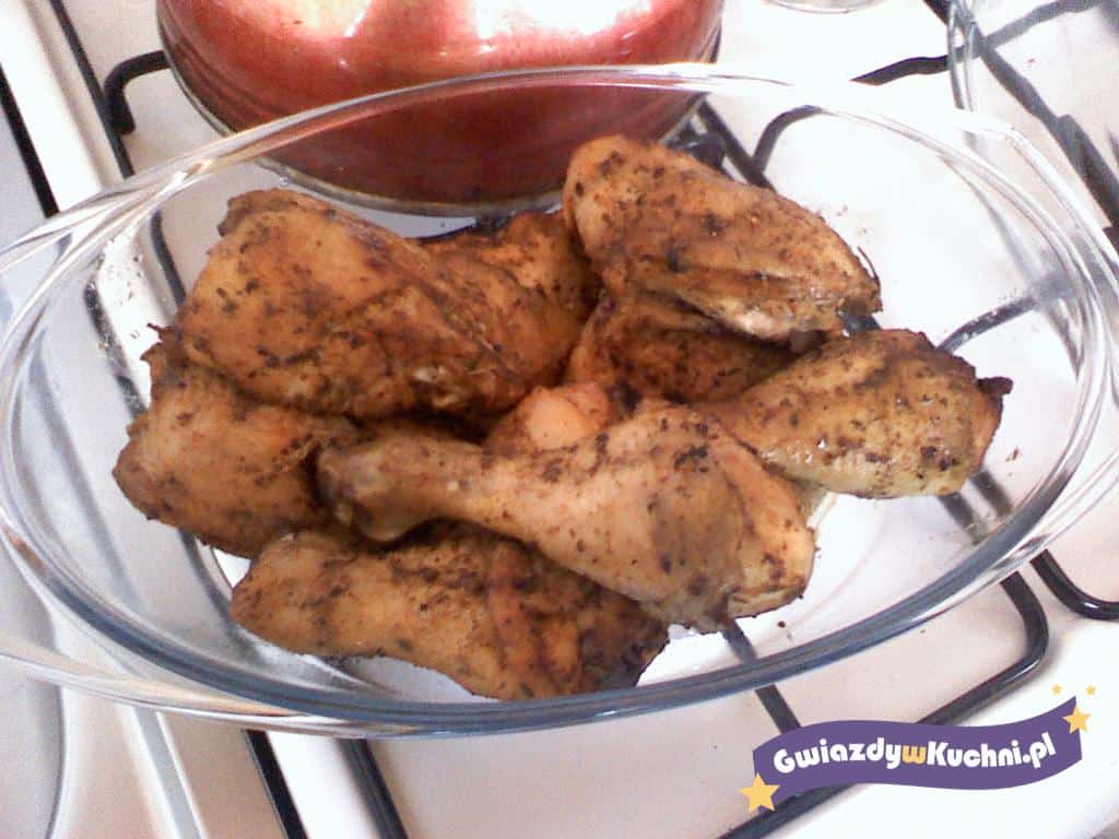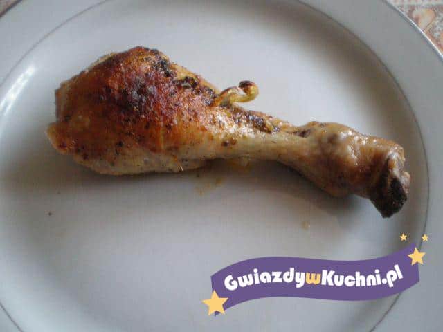 Udka z kurczaka opłukać i osuszyć. Natrzeć je solą, pieprzem i majerankiem. Ułożyć w naczyniu żaroodpornym lub włożyć do rękawa do pieczenia mięs. Udka obłożyć talarkami cebuli i kawałkami masła, podlać wodą. Mięso piec przez 1, 5 godziny w temperaturze 200 stopni.