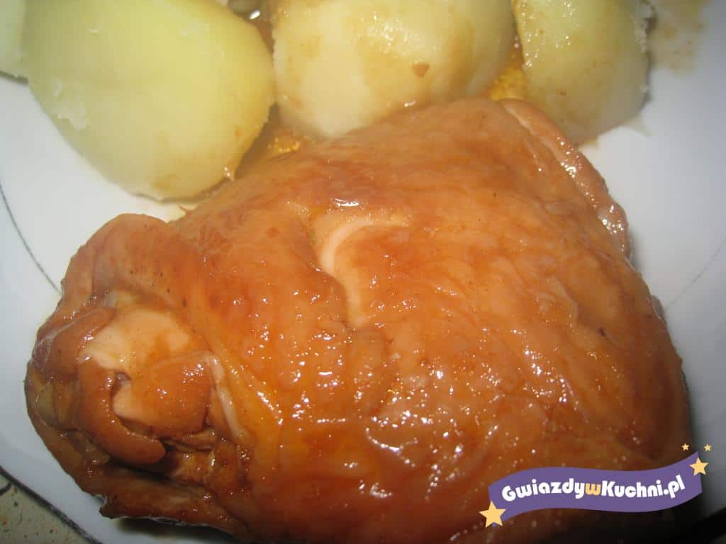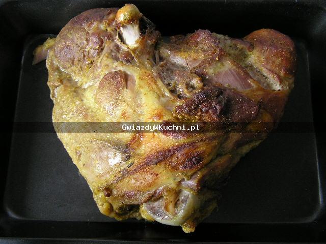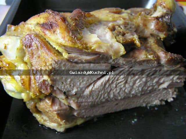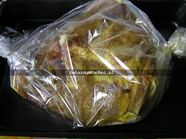 Zrobić marynatę, wymieszać sól, pieprz, curry olej oraz drobno posiekany czosnek. Natrzeć mięso marynatą. Zostawić na 12 godzin w lodówce. Wyjąć, włożyć do folii. Piec w temperaturze 180 stopni do 1,5 godziny.