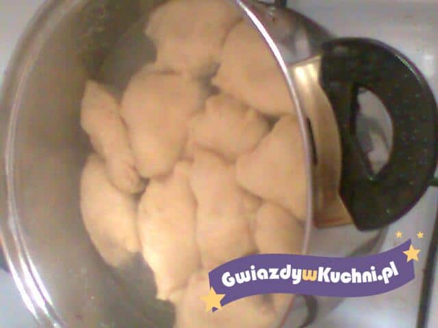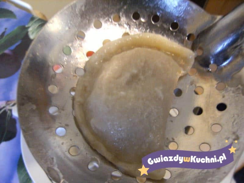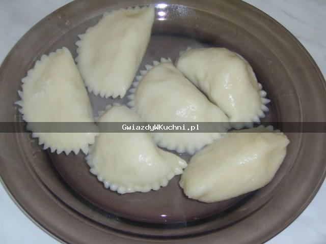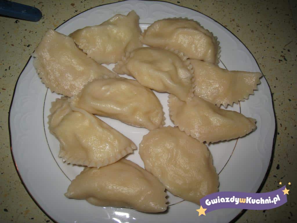 Ziemniaki opłukać zimną wodą, oczyścić, obrać, ugotować, ostudzić, obrać, rozgnieść widelcem. Cebulę obrać, posiekać, przesmażyć na rozgrzanym maśle. Ziemniaki połączyć z cebulą, serem białym, wymieszać, przyprawić solą i pieprzem. Z mąki, jajek, soli, oleju i ciepłej wody zagnieść ciasto na pierogi, rozwałkować, wyciąć krążki. Każdą porcję ciasta napełnić farszem, zlepić, ugotować we wrzątku osolonym. Rozgrzać smalec, polać ugotowane pierogi.