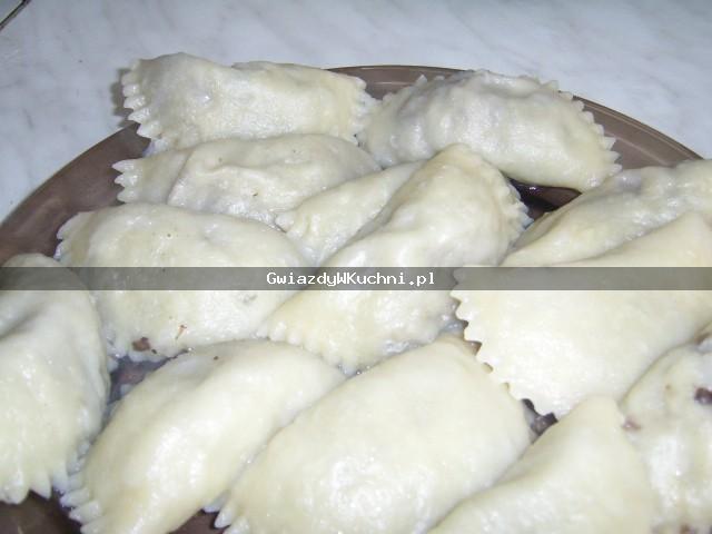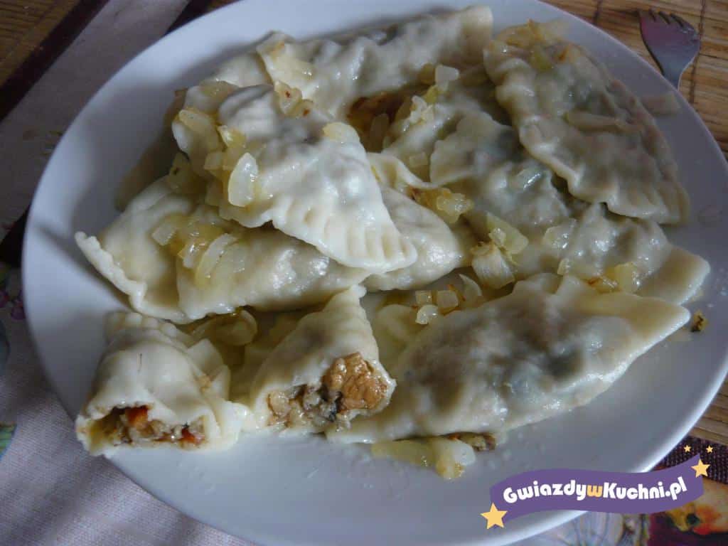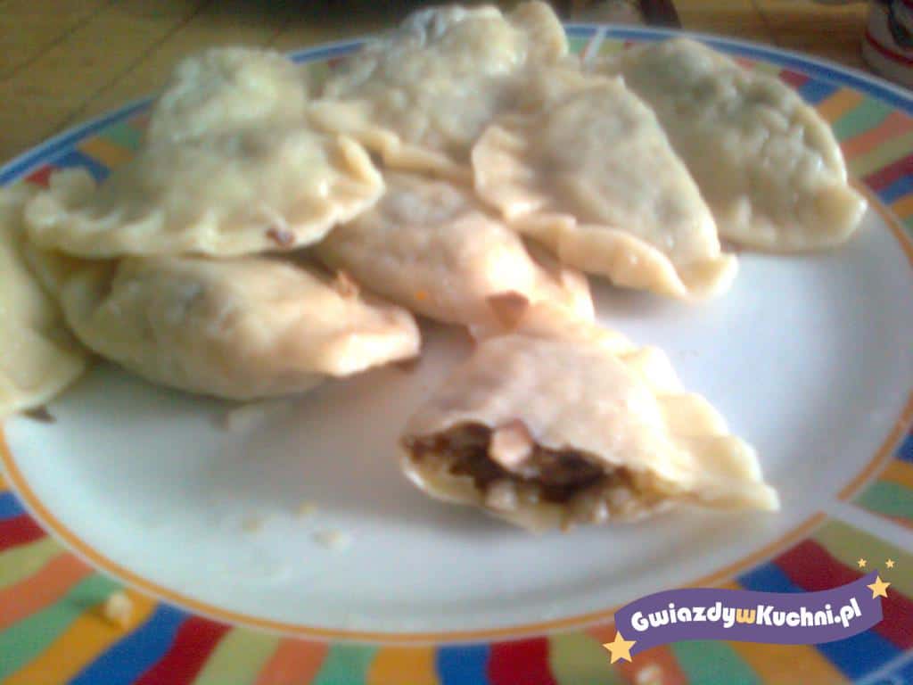 Grzyby oczyścić, umyć (suszone zalać 1/21 wody, odstawić do napęcznienia). Gotować do miękkości, odcedzić i drobno posiekać (wywar zachować). Obrane cebule posiekać, zeszklić na maśle. Dodać grzyby z wywarem. Gotować powoli, aż odparuje prawie cały płyn. Wymieszać z bułką tartą i doprawić do smaku. Do mąki ze szczyptą soli wbić jajko, wlać ok. 2/3 szklanki wody i zagnieść ciasto. Przykryć, odstawić na 30 minut. Cienko rozwałkować, wykroić szklanką krążki. Nakładać łyżeczką farsz. Zlepić mocno brzegi, formując pierogi. Gotować w lekko osolonym wrzątku. Gdy wypłyną, do-gotować jeszcze 2 minuty na wolnym ogniu. Wyjąć, osaczyć. Podawać z wody lub podsmażone (np. na pokrojonym w kostkę boczku), posypane szczypiorkiem.