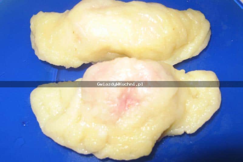 Podzielić na 4 części, każdą rozwałkować i wycinać kółka szklanką lub foremką pierogową. W środek każdego kółka układać łyżkę nadzienia, składać na pół i zlepiać brzegi.