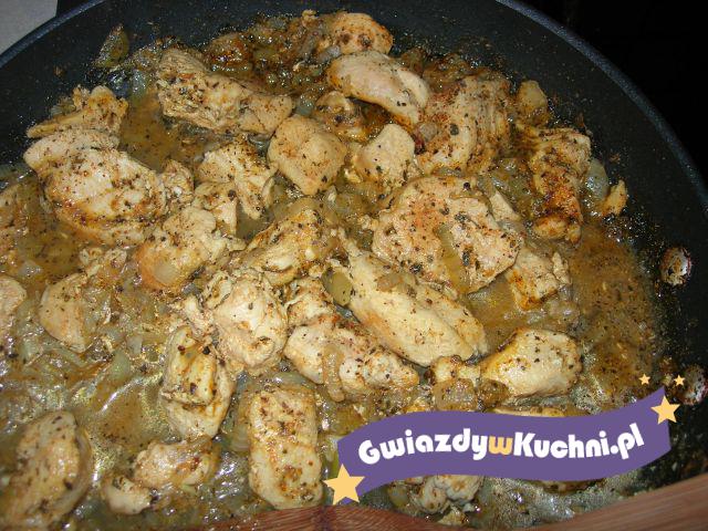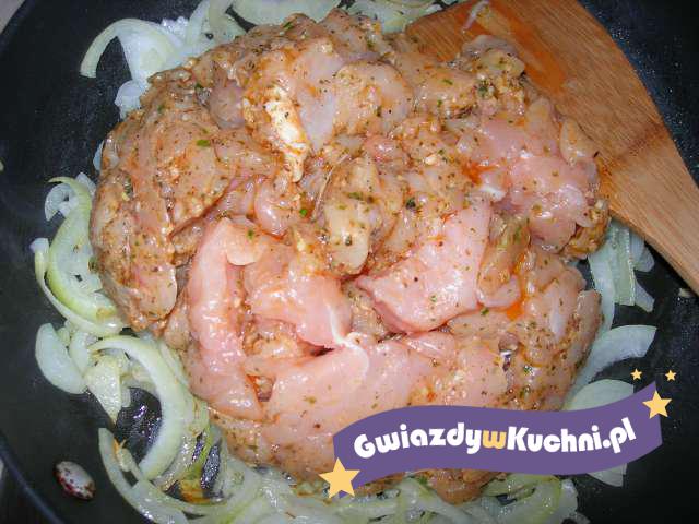 Pierś myjemy, kroimy, przyprawiamy przyprawami, skrapiamy oliwą, odstawiamy do lodówki na 2 godziny. Na patelni rozgrzewamy oliwę, podsmażamy cebulę pokrojoną w plastry, dodajemy pierś, dusimy, aż indyk dojdzie. Podajemy z ryżem.