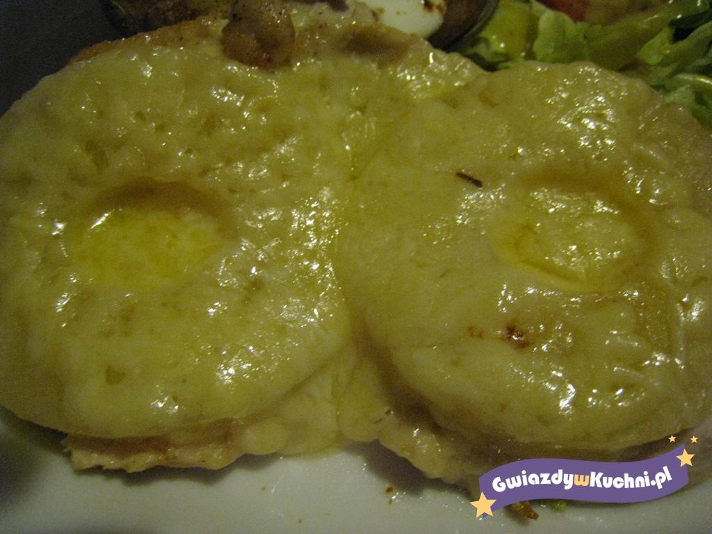 Ser żółty zetrzeć na tarce. Piersi z kurczaka umyć, dodać przyprawy, odstawić na 10 minut. Piersi z kurczaka podsmażyć na oliwie z dwóch stron. Na każda pierś położyć dwa plasterki ananasa, przykryć pokrywką i na małym ogniu podsmażyć, aby ananas delikatnie zmiękł, potem dodać ser żółty i jeszcze chwilkę pod pokrywką potrzymać.