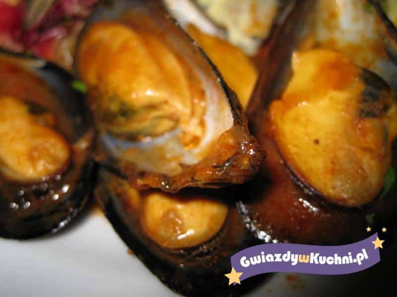 Włożyć małże, przykryć garnek i gotować na dużym ogniu 5 minut, wstrząsając od czasu do czasu, aż muszle się otworzą. Te które się nie otworzyły wyrzucić. Doprawić pieprzem i podawać od razu, posypując reszta pietruszki.
