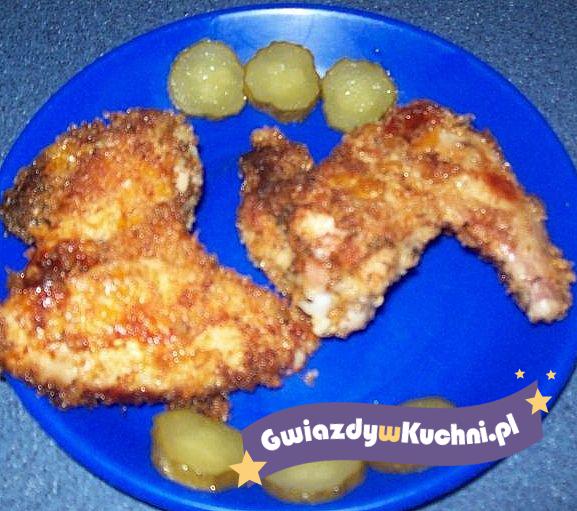 Skrzydełka gotujemy w bulionie warzywnym. Osączamy z nadmiaru rosołu na sicie. W między czasie przygotowujemy panierkę. Mąkę mieszamy z solą, pieprzem i ostrą papryką. Na następnym talerzu roztrzepujemy jajko. A na trzecim talerzy mieszamy bułkę tartą z pogniecionymi płatkami kukurydzianymi. Skrzydełek obtaczamy najpierw w mące, potem w jajku a na końcu w płatkach kukurydzianych. Smażymy na patelni na rozgrzanym oleju na złoty kolor.