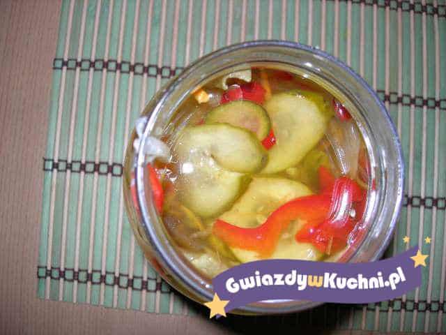 Zagotować wodę z solą, cukrem i przyprawami, dodać ocet, wymieszać i ostudzić.