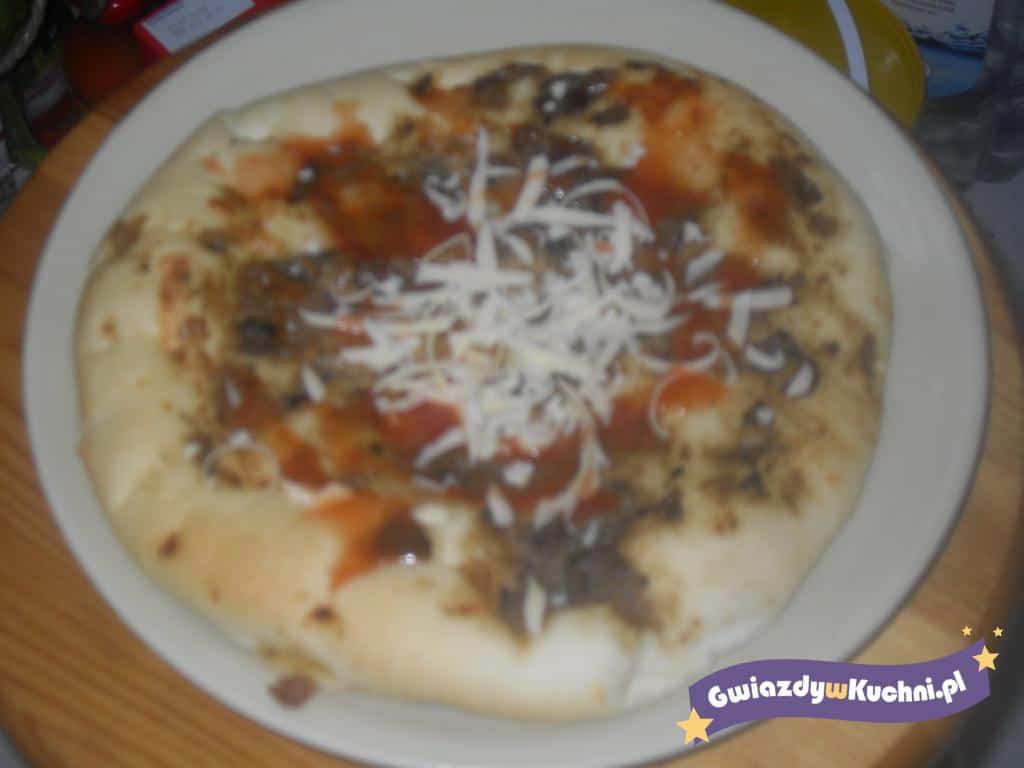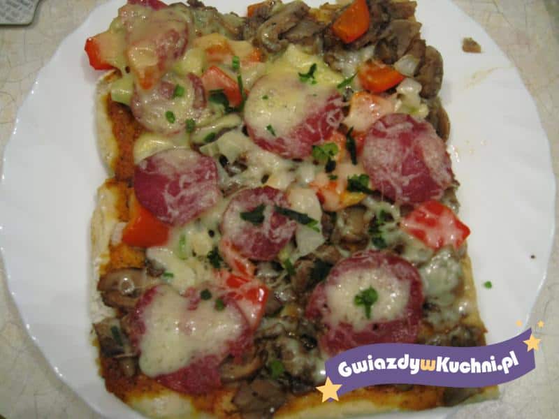 Blat pizzy posmaruj koncentratem. Na wierzchu ułóż pokrojoną szynkę, paprykę cebulę i posyp startym serem oraz przyprawą do pizzy. Piecz 20 minut w piekarniku.