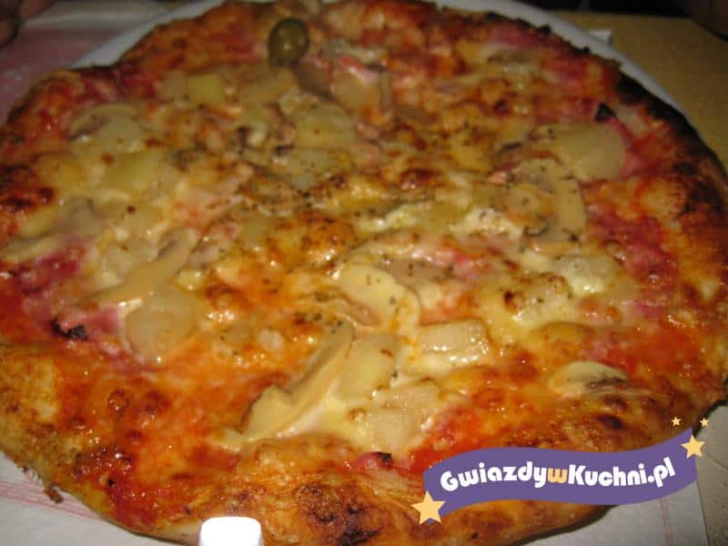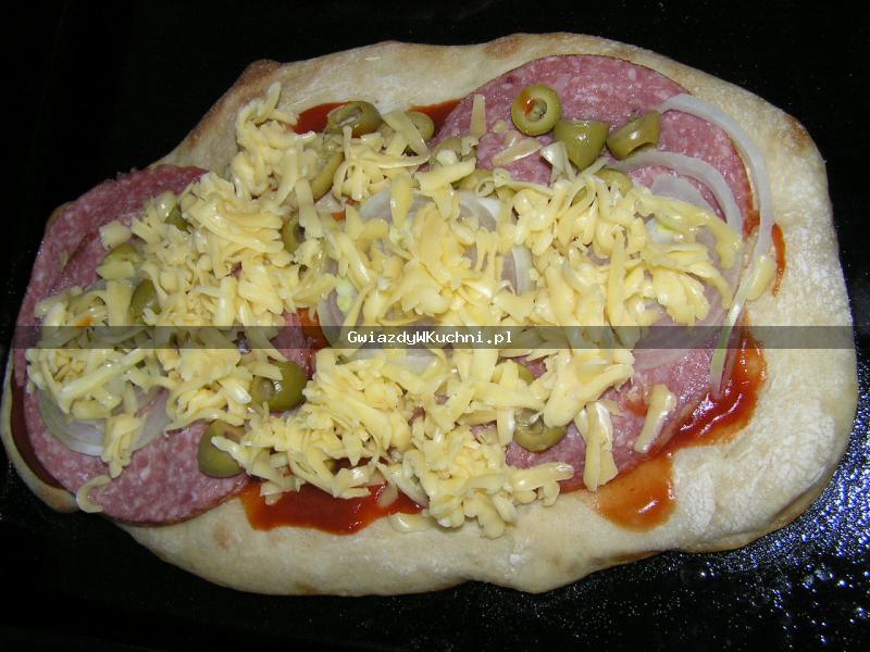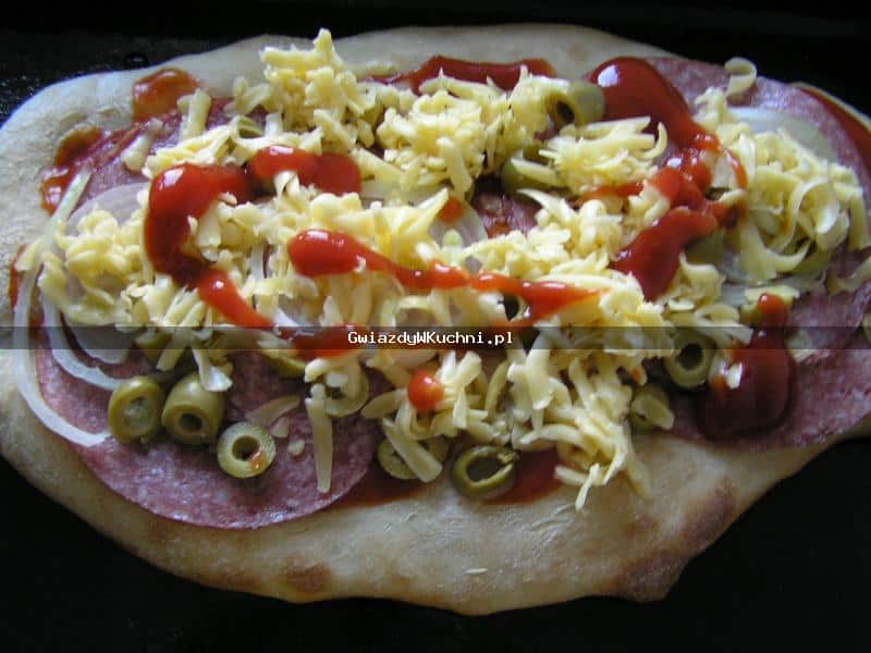 Ciasto rozrolować w kształt koła. Po około 10 minut ciasto jest wyrośnięte. Następnie należy ciasto nakłuć widelcem kilkakrotnie i posmarować sosem do sporządzenia pizzy. Tak przygotowane ciasto obłożyć cebulą, oliwkami, salami oraz serem i keczupem. Piec 30 minut