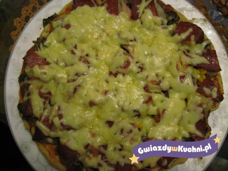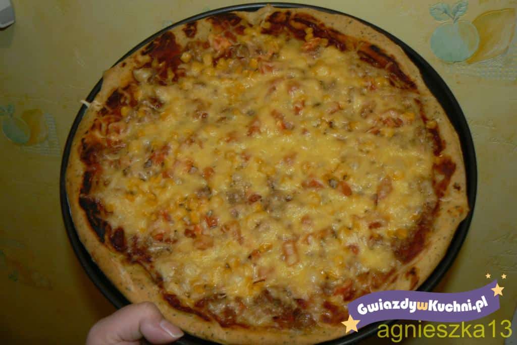 Zrobić dowolne ciasto na pizzę. Tuńczyka odcedzić. Ciasto posmarować koncentratem, ułożyć na nim tuńczyka, pokrojonego w kostkę pomidora i odcedzoną kukurydzę, posypać startym serem. Piec ok 30 min w temp. 180’c