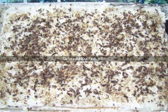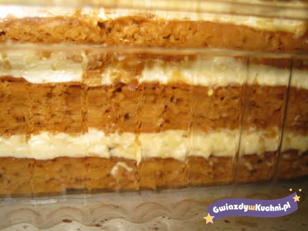 Z podanych składników zagniatamy ciasto (maka, cukier, śmietana, soda, jajko, miód) i pieczemy 3 placki (każdy osobno). Z mleka, cukru i mąki gotujemy budyń. Po ostygnięciu (musi być zimny) ucieramy z margaryną. Ostygnięte placki smarujemy masą.