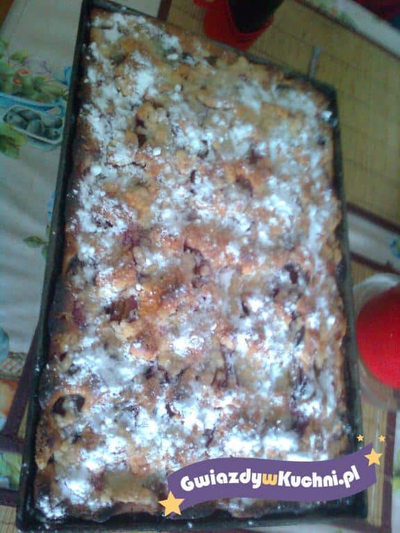 4. Wyrośnięte ciasto ponownie zagnieć. Rozwałkuj, przenieś na blachę wyłożoną pergaminem. Na cieście rozłóż połówki śliwek (przeciętą stroną do góry). Na placek zetrzyj ciasto na kruszonkę. Wstaw do piekarnika rozgrzanego do temp. 180 stopni Piecz 40 minut. Posyp cukrem pudrem i cynamonem.