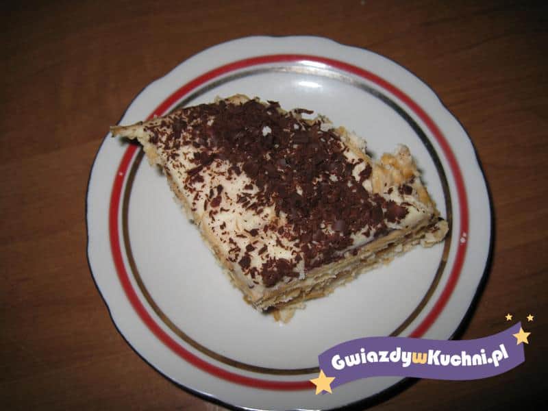 Krem budyniowy rozsmarowujemy na placku i przykrywamy plackiem z karmelem.