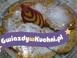 Białka ubić na pianę. Do miski wlać mleko dodać resztę składników i dokładnie wymieszać. Jabłka obrać, zetrzeć na tarce o dużych oczkach dodać do ciasta i wymieszać z pianą z białek. Placuszki smażymy na rozgrzanym tłuszczu na złoty kolor, i posypać cukrem pudrem.