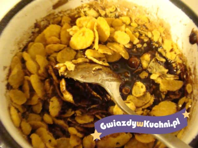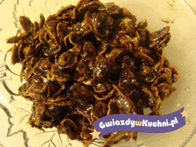 Tłuszcz stopić, dodać miód, cukier i kakao. Do masy wsypać płatki kukurydziane, wymieszać, przełożyć salaterki.