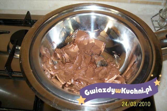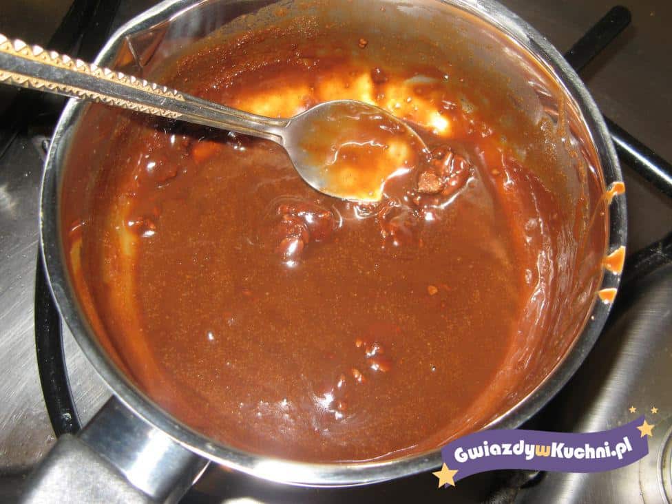 Do rondla wlewamy olej i lekko podgrzewamy. Czekoladę ścieramy na tarce z grubymi oczkami i dodajemy do oleju. Dokładnie mieszamy i ucieramy na jednolitą masę.