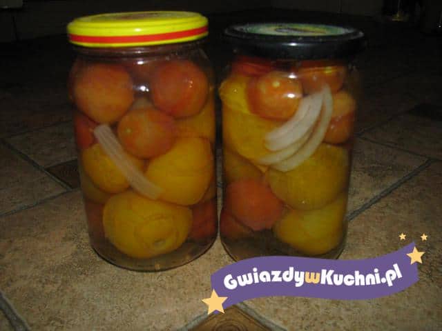 Pomidory opłukać. Przygotować zalewę z octu, wody, cukru. Cebulę obrać, pokroić na krążki. Do słoików wsypywać po kilka ziaren gorczycy, wkładać po krążku cebuli, 2 kolory pomidorów, napełniać zalewą. Zakręcone słoiki gotować przez 10 – 15 minut.