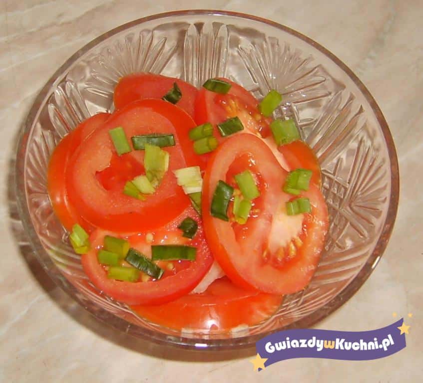 Pomidory myjemy, obieramy, kroimy na ćwiartki. Szczypiorek drobno siekamy, dodajemy do pomidorów. Mieszamy.