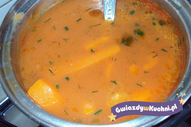 Wodę gotujemy z boczkiem przez około 20 minut. Marchewkę obieramy, część kroimy w kostkę, a resztę kroimy po długości na pół, wrzucamy do gotującego się boczku. Doprawiamy solą i pieprzem, dodajemy koncentrat pomidorowy, ryż, gotujemy do momentu aż marchew, ryż będzie miękkie. Na koniec jak odstawimy już z ognia posypujemy posiekanym koperkiem zupę.