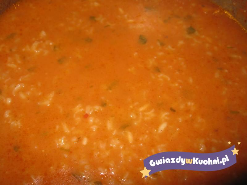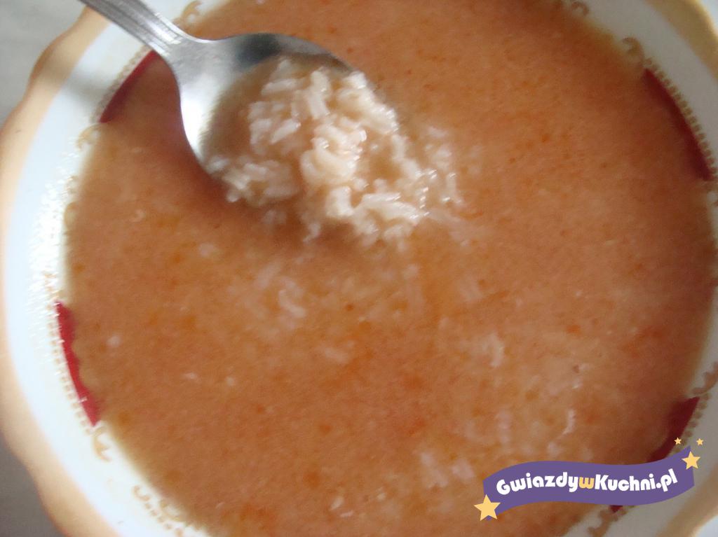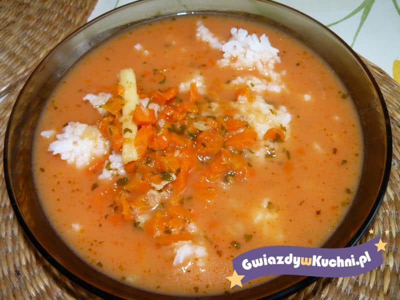 Z porcji rosołowej i włoszczyzny gotujemy bulion. Wyciągamy mięso i kroimy w drobną kostkę ugotowane warzywa. Dodajemy koncentrat, przyprawy i natkę pietruszki. Następnie zabielamy zupę i wrzucamy ugotowany ryż.