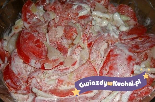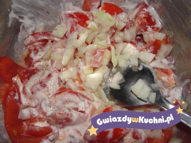Pomidorka pokroić w kawałki, cebulkę drobniej. Wszystko łączymy i dolewamy śmietanę, sól i pieprz.