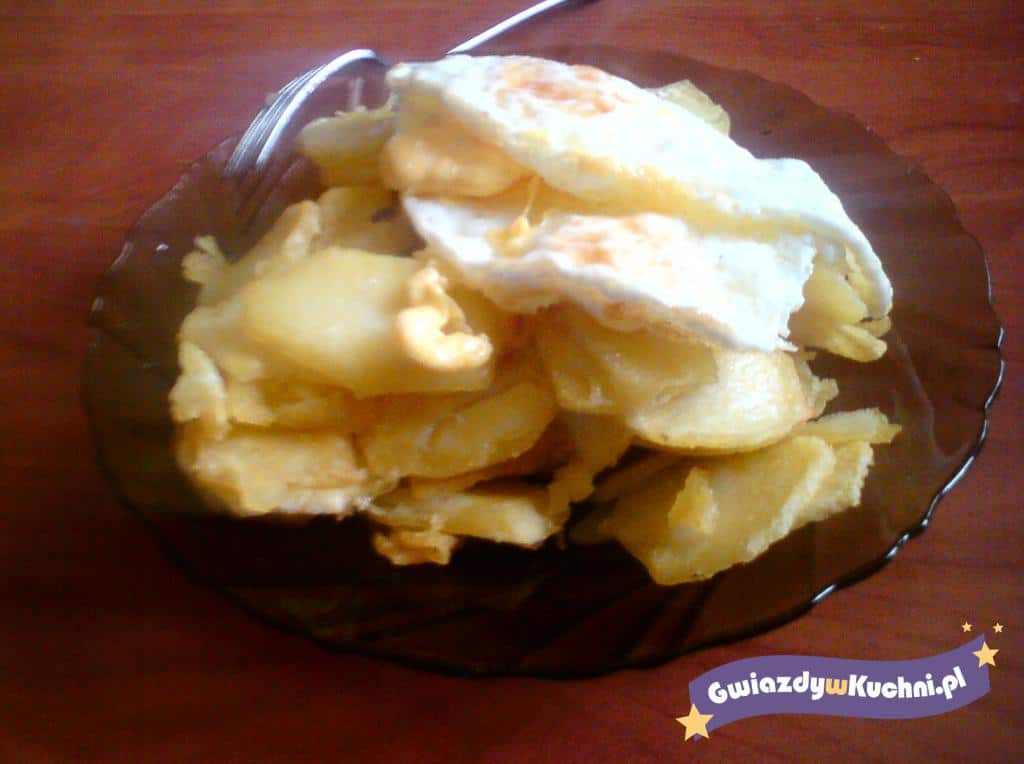 Ziemniaki obieramy, kroimy w różne grubości plastry, przygotowane plastry ziemniaków płuczemy w zimnej wodzie, wysuszamy i smażymy na rumiany kolor w rozgrzanym oleju. Następnie odsączamy z zawartości tłuszczu, i na tym samym rozgrzanym oleju, smażymy jajka na miękko posypane z odrobiną soli. Jajka dodajemy do ziemniaków i pyszny obiad gotowy. Całość można posypać solą, polać majonezem lub keczupem.