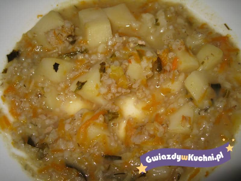Skrzydełka z gęsi myjemy i gotujemy w wodzie, po około 30 minutach dodajemy pokrojone ziemniaki, marchewkę i pietruszkę dolewamy mleko i dalej gotujemy aż mięso będzie miękkie. Kaszę płuczemy kilka razy i dosypujemy ją do ziemniaków. Przyprawiamy kucharkiem lub wegetą, solą, pieprzem oraz dodajemy magii. Jeszcze 5 minut gotujemy. Podajemy na talerzach. Posypujemy natką