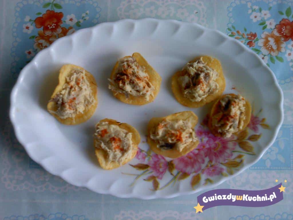 Chipsy rozkładamy na tacce bądź też talerzykach. Makrelę obieramy z ości i ze skóry. Doprawiamy do smaku musztardą oraz jajkiem ugotowanym na twardo i startym na tarce o małych oczkach. Pastę powstałą dokładnie mieszamy ze sobą, aż składniki się połączą. Gotową nakładamy na przygotowane chipsy i posypujemy do smaku papryką. Smacznego !!