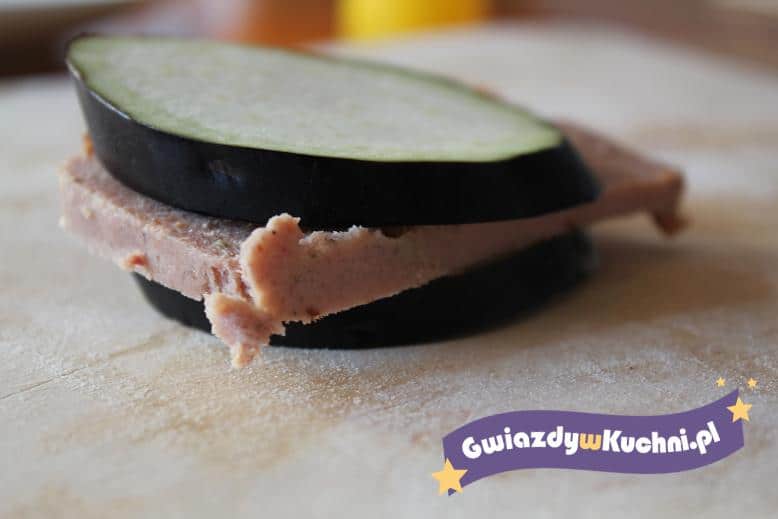 Bakłażana umyć, pokroić w grubsze plastry, również pasztet pokroić w grubsze plastry. Na efektownej tacy układać krążki bakłażana na nich pasztet i na nich znów bakłażana.