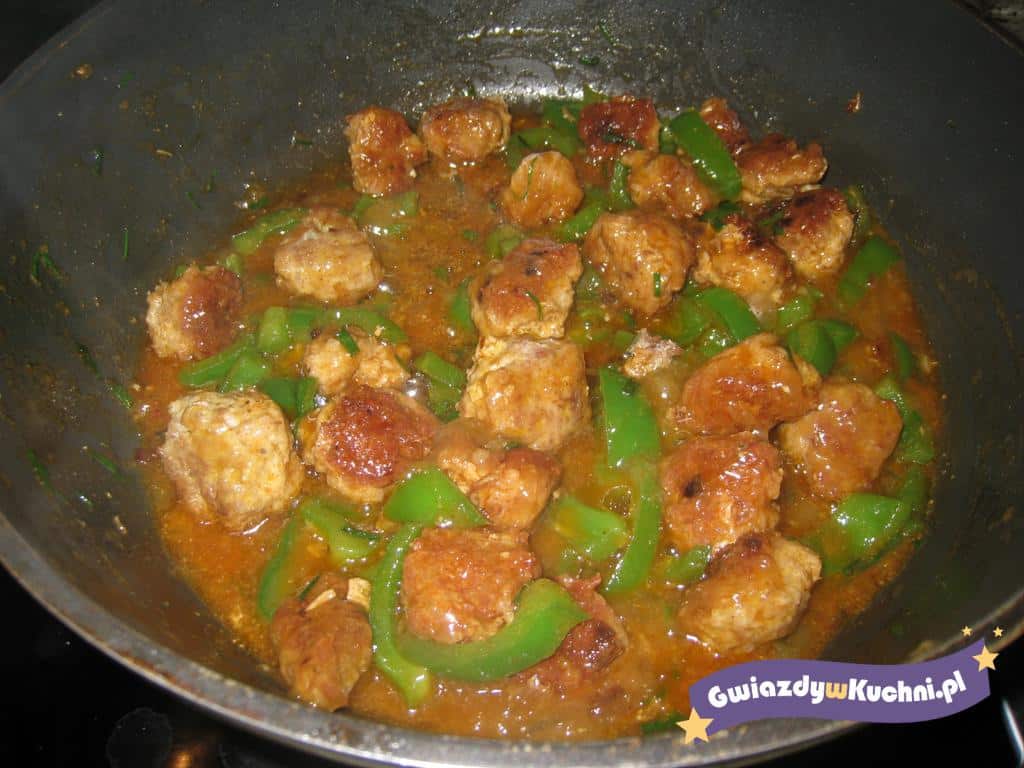 Czosnek obrać i drobno posiekać. Mięso wyrobić z kaszą, jajkiem, czosnkiem na spoistą masę. Doprawić do smaku solą i pieprzem. Z masy mięsnej uformować kulki i podsmażyć je na rozgrzanym oleju ze wszystkich stron. Zalać bulionem z kostki, chwilkę gotować, wrzucić pokrojoną paprykę i dusić ok. 15-20 min.