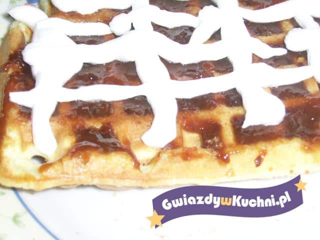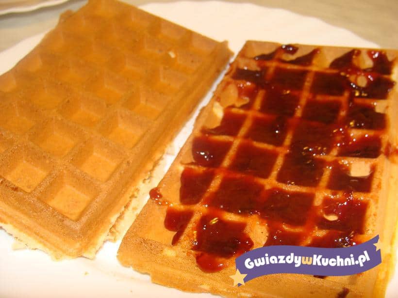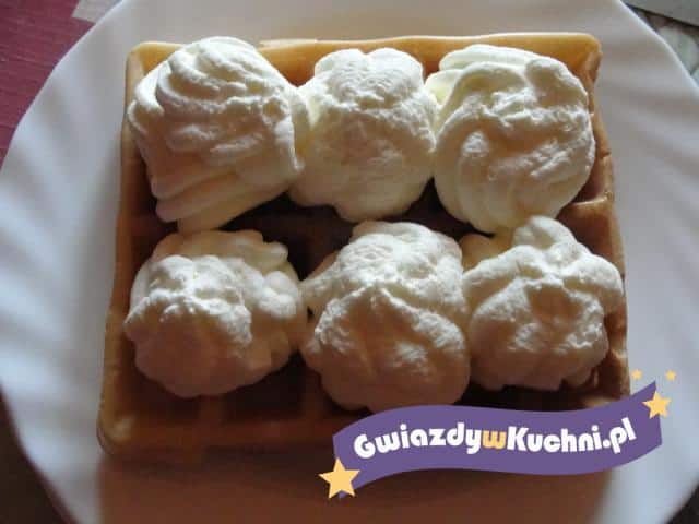 Masło proszę w całości rozpuścić, następnie dodać jajka, cukier, mąkę pszenną oraz mleko, wszystko ze sobą miksować przez 3- 4 minuty, do momentu gdy powstanie gładka masa, bez żadnych grudek. Gofrownicę proszę dobrze rozgrzać i wysmarować ją dokładnie tłuszczem, następnie wlać na nią ciasto na gofry i piec około 4- 5 minut. Do momentu ze złocenia. Dobrze smakują z bitą śmietaną i owocami albo dżemem.