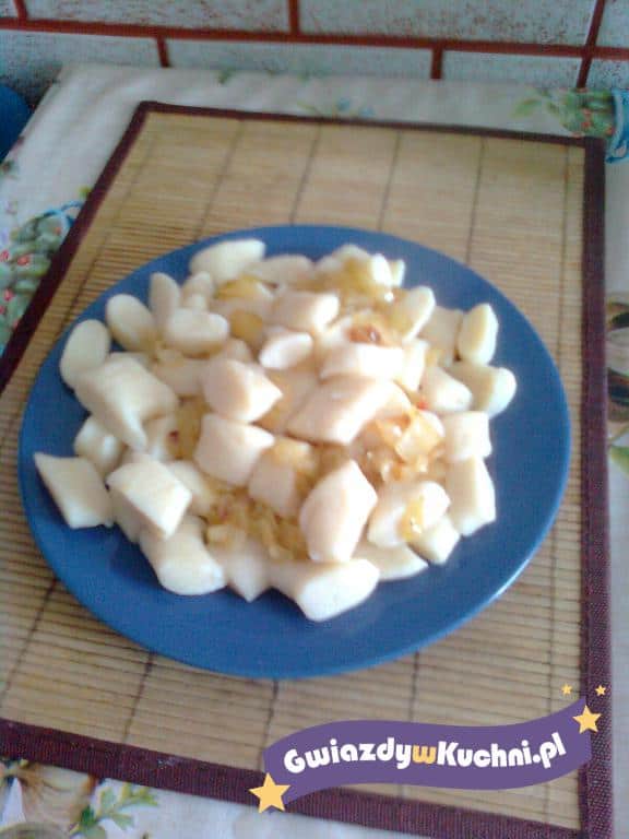 Ziemniaki ugotować i przecisnąć przez praskę. Do zimnych dodać mąkę, jajko, starty ser żółty, sól i zagnieść ciasto. Na posypanej mąką stolnicy uformować wałek, spłaszczyć go i pokroić ukośne kluski. Włożyć do osolonego wrzątku, ugotować, odcedzić. Boczek pokroić w kostkę, stopić. Otrzymanym tłuszczem polać kopytka.