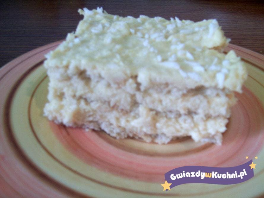 Z mleka odlać 1 1/2 szklanki i dodać do tego cukier, cukier waniliowy, żółtka, mąkę pszenną i ziemniaczaną – wymieszać. Pozostałą część mleka zagotować i ugotować budyń. Po ostudzeniu budyń utrzeć z margaryną i wiórkami (1 1/2 paczki). Przełożyć 3 warstwy na przemian z krakersami (krakersy, masa, krakersy, masa, krakersy, masa), na wierzchu posypać pozostałymi wiórkami.