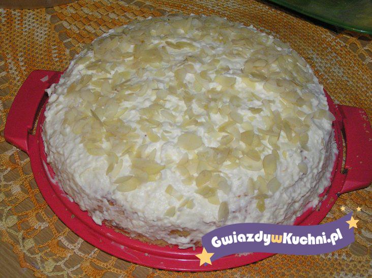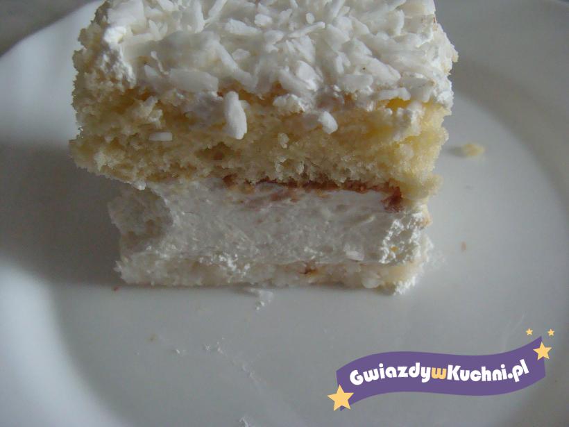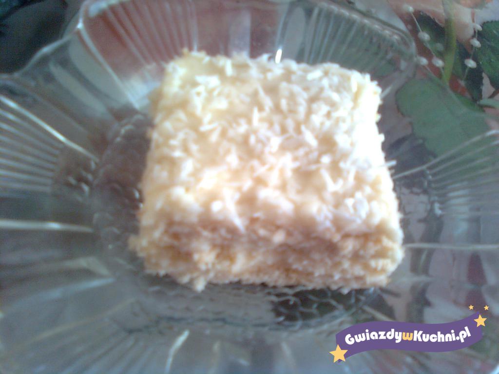 Ubić śmietanę ze „Śnieżką”, dodać kokos, rozpuszczoną i przestudzoną białą czekoladę.