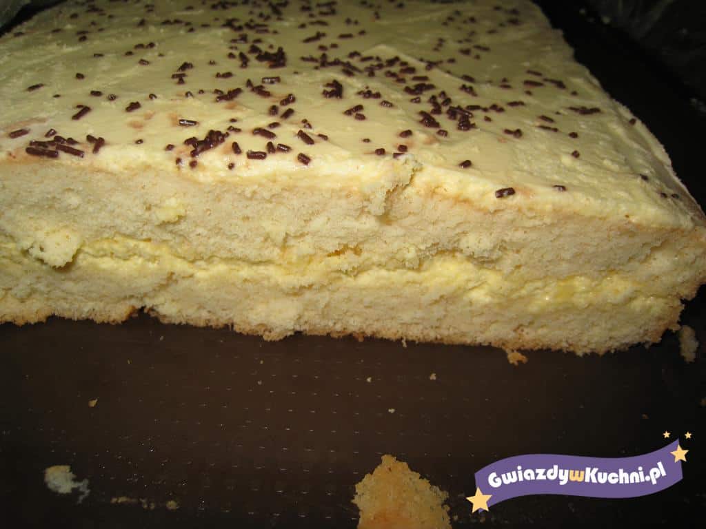 Białka ubić na sztywno, dodać cukier, cukier waniliowy, żółtka, mąkę z proszkiem. Piec 40 minut w temp. 150 C stopni. Przekroić na pół po upieczeniu.