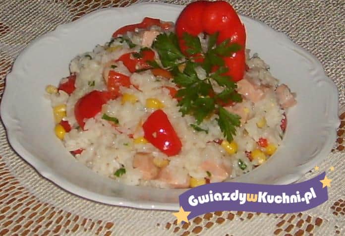 Ryż opłukać i ugotować na sypko w osolonej wodzie. Paprykę oczyścić, umyć i pokroić w średnią kostkę. Cebulę pokroić w piórka i przesmażyć na oleju. Dodać pokrojoną w kostkę wędlinę i paprykę. Dusić do pół miękkości papryki. Dodać ryż. Podlać bulionem i dusić na małym ogniu 10 – 15 minut. Dodać kukurydzę i posiekaną natkę pietruszki. Doprawić solą i pieprzem do smaku.